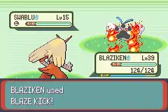 The end of Blaziken's leg blazes in flames and it kicks the opponent. | ||