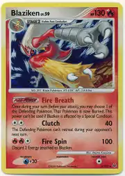 Blaziken (Japanese: バシャーモ Bursyamo) is a Fire-type Stage 2 Pokémon card. It is part of the Platinum expansion.