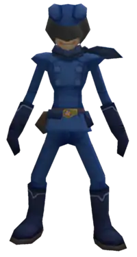 He is dressed uniquely as compared to most other male Cipher Peons. His outfit is a much darker blue than what the usual peon wears.