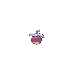 Bounsweet is a small Pokémon resembling a mangosteen. Most of its body is pinkish-purple with a short, white skirt around its waist, which resembles the flesh of a mangosteen when it is cut open. It has beady yellow eyes and two tiny legs. On top of its head is a green calyx. This structure consists of four leafy green formations and a short stem.