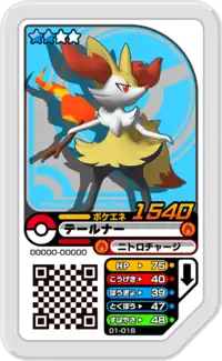 Braixen (Japanese: テールナー Tairenar) is a Grade 2 Pokémon Ga-Olé disk. It is part of the first set.