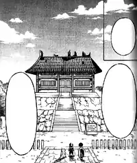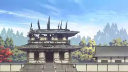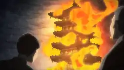 A Buddhist temple in the real world city of Kyoto, covered in gold leaf, is known as Kinkaku-ji. Like this tower, it was burned down; however, unlike it, it was reconstructed. The likeness of a phoenix rests atop the tower.