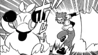 Hariyama reappears in The Beginning of the End with Kyogre & Groudon VIII, during the fight against Groudon. Brawly has Hariyama wake up Machoke after it got hit by the electricity in the air that Groudon absorbed. Hariyama battles with Blaise in The Beginning of the End with Kyogre & Groudon IX. It had no trouble handling Blaise's illusionary skills and his two illusion-producing Slugma, where one Fake Out startles them and leaves them wide open for another attack. Hariyama uses this opportunity to use Arm Thrust on them. The battle continued in the next chapter and The Beginning of the End with Kyogre & Groudon XII. During the twelfth part of the Kyogre and Groudon battle, Hariyama defeats the two Slugma using the tactics Brawly learned from his old friend Bruno. After the battle, Hariyama, along with its Trainer, get exhausted since they spent most of their vitality countering Blaise's illusions, allowing Blaise to flee the Lilycove Museum.