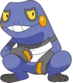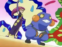 Croagunk was first seen resting outside a supermarket in Gymbaliar!. When Meowth emerged from it, Croagunk followed him to where Team Rocket was using a fake Gym to steal unsuspecting Trainers' Pokémon. Their plan was going badly as it required Jessie to win, but her Dustox kept losing. As a result, she spotted Croagunk and decided to use him, subsequently winning many battles with him. After Ash and his friends entered the Gym, Croagunk lost against Ash's Aipom. Team Rocket resorted to grabbing Ash's Pikachu and running off, leaving Croagunk behind in the process. Brock was the first to notice Croagunk and felt a connection with him; Croagunk later willingly went into Brock's Poké Ball.