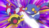 In Losing Its Lustrous!, Brock begins flirting with a Nurse Joy, but after a few seconds feels that something is wrong and notices that Croagunk didn't stop him. He notices him instead staring out a window, causing Brock to worry over Croagunk's behavior. The reason is later revealed to be Croagunk sensing Saturn's Toxicroak with his Anticipation Ability. When it ends up getting close to Brock's location, Croagunk releases himself from his Poké Ball and runs off to find it and start a battle. Later on Croagunk is seen falling through the skylight and lands hard on the ground. Toxicroak follows and hits Croagunk dead-on with a Poison Jab, knocking him out while Brock watches helplessly on from the roof.