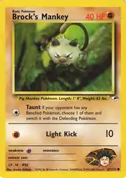 Brock's Mankey (Japanese: タケシのマンキー Takeshi's Mankey) is a Fighting-type Basic Pokémon card. It is part of the Gym Heroes expansion.