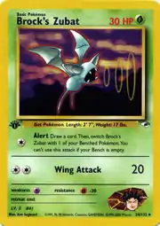 Brock's Zubat (Japanese: タケシのズバット Takeshi's Zubat) is a Grass-type Basic Pokémon card. It is part of the Gym Heroes expansion.