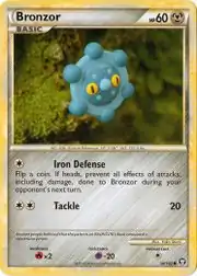 Iron Defense and Tackle are both moves in the Pokémon games that Bronzor can learn. This card's Pokédex entry comes from Pokémon HeartGold and SoulSilver.
