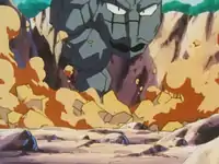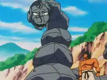 Bruno jumped down to find out why Onix was violent. Bruno avoided the hits thrown by Onix. After a while, Bruno found the reason why Onix was on a rampage: a Sandslash had been stuck between two of its boulders, which was hurting it. After Bruno removed the Sandslash, Onix became very thankful for him and accepted to join his team, so Bruno threw a Poké Ball at Onix and captured it. It hasn't been seen since.