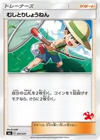 Bug Catcher (Japanese: むしとりしょうねん Bug Catcher Boy) is a Supporter card. It was first released as part of the Unified Minds expansion.