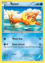 Water Gun and Quick Attack are both moves in the Pokémon games that Buizel can learn. This card's Pokédex entry comes from Pokémon X.
