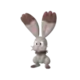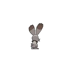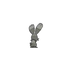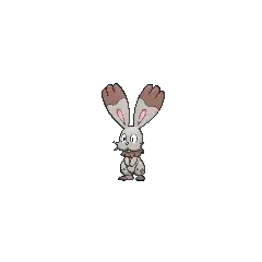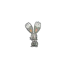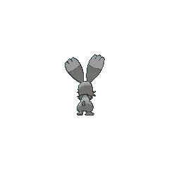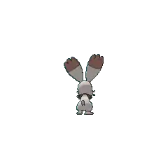 Bunnelby is a small, gray, rabbit-like Pokémon. The tips of its large ears are dark brown and have three finger-like sections each. It has black eyes, a small pink nose, prominent round cheeks, two tiny whiskers on each cheek, and large upper incisors. Its neck is surrounded by a ruff of stiff, brown fur. There are small brown spots on its hind legs and it has brown toes. It also has a fluffy gray tail.
