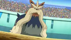 | Stoutland was used in Reunion Battles In Nimbasa! during her battle against Ash in Don George's tournament in Nimbasa Town and is considered her new "premium brand". It faced off against Ash's Palpitoad where it had a lead using Ice Fang after Thunder Fang failed, but was brought down by Hydro Pump.