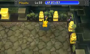 The Buried Ruins (Japanese: なぞの地下遺跡 Mysterious Underground Ruins) are a special dungeon in Pokémon Mystery Dungeon: Gates to Infinity. It is only accessible through certain jobs on the Challenge Request Board in Pokémon Paradise. The dungeon only contains one room. Only one member of the player's team can go into the dungeon, however they can enter with up to three other players via Local Wireless. Once entering the dungeon, the player will battle the Pokémon they are requested to defeat, along with three other Pokémon. The job is completed when all four Pokémon are defeated. Once the leader is defeated, the remaining enemy Pokémon will enter the Enraged status. No items appear on the floor and none are any dropped by enemy Pokémon.