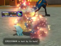 Burn (Burned when inflicted in-game) is a negative status in the Rumble series. When a Pokémon is affected by a burn, its HP will gradually drain at a rate determined by the Power of the Pokémon that inflicted it for ten seconds. However, if the affected Pokémon is controlled by a player, moving around will make the condition wear off faster, with the minimum duration depending roughly on the Pokémon's Speed. Additionally, while burned, most of the Pokémon's attacks will have their damage reduced to about 60% of their normal values. While Burned, red smoke emanates from the affected Pokémon's head.