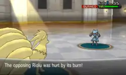 In PS561, Korrina's Lucario was burned by a Will-O-Wisp from Essentia's Trevenant.