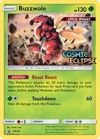 Buzzwole (Japanese: マッシブーン Massivoon) is a Grass-type Basic Pokémon card. It was first released as part of the Cosmic Eclipse expansion.