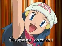 Dawn is shown in different poses, along with Ash's hat and Pikachu's ear. Dawn strikes a pose, displaying her pink-colored Pokétch, and the scene transitions into Dawn catching a coin she tossed in the air. Dawn is looking at the sky together with Ash, Pikachu, Brock and Piplup. Piplup climbs onto Dawn's shoulder, and they smile. Ash, Brock, and their Pokémon are playing together on a hill while Dawn rests against a tree with Piplup, who is sleeping. The group are later seen playing in the snow. Pikachu, Piplup and Dawn appear on the screen in rapid order. Dawn smiles, and a shot of her and her Pokémon appears. Dawn winks, and Brock is seen with a sombrero costume and maracas with his Pokémon. Dawn appears with a serious look, then a shot of Ash and his Pokémon appears. The group is running against a mountain backdrop, as the group jumps, the background changes to a valley with a waterfall and rainbow. Dawn smiles, and a shot of the group's Pokémon appears. Dawn winks at the camera, then Team Rocket is seen crashing and falling down a pitfall trap. She appears with a serious look again, then she appears jumping, with a Poké Ball in her hand. Dawn, Ash and Brock are running against a mountain backdrop again. It ends with a shot of the group, Team Rocket, and their Pokémon.