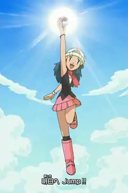 Dawn is shown in different poses, along with Ash's hat and Pikachu's ear. Dawn strikes a pose, displaying her pink-colored Pokétch, and the scene transitions into Dawn catching a coin she tossed in the air. Dawn is looking at the sky together with Ash, Pikachu, Brock and Piplup. Piplup climbs onto Dawn's shoulder, and they smile. Ash, Brock, and their Pokémon are playing together on a hill while Dawn rests against a tree with Piplup, who is sleeping. The group are later seen playing in the snow. Pikachu, Piplup and Dawn appear on the screen in rapid order. Dawn smiles, and a shot of her and her Pokémon appears. Dawn winks, and Brock is seen wearing a sombrero and maracas with his Pokémon. Dawn appears with a serious look, then a shot of Ash and his Pokémon appears. The group is running against a mountain backdrop, as the group jumps, the background changes to a valley with a waterfall and rainbow. Dawn smiles, and a shot of the group's Pokémon appears. Dawn winks at the camera, then Team Rocket is seen crashing and falling down a pitfall trap. She appears with a serious look again, then she appears jumping, with a Poké Ball in her hand. Dawn, Ash and Brock are running against a mountain backdrop again. It ends with a shot of the group, Team Rocket, and their Pokémon.