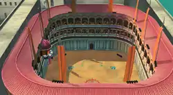 The castle is a large white stone structure with red roofing, and its highest point is a four-faced clock tower. It is connected to the town by a long bridge. At the back of the castle is a cable car track, which stops at the other side of the lake. Besides the castle, there is a large adjoining stadium for Pokémon battles, which is used for the battle tournament of Rota's annual festival.