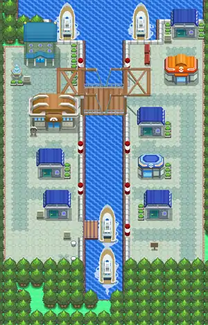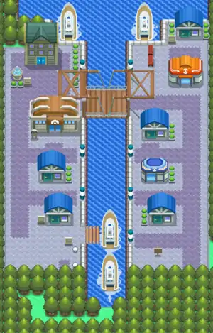 Canalave City (Japanese: ミオシティ Mio City) is a city in the Sinnoh region. Canalave City is a port city that is bisected by a canal which is crossed by a small drawbridge. It has an air of exotic and foreign culture. In Platinum, its entrance is blocked until the player defeats Cyrus at Celestic Town. Large ships are moored at the piers. In the old days, the port used to be a hub of cargo transportation. The Move Deleter is in a house on the east side of town. The Canalave Library has many books on Sinnoh myths. The ferry in the canal will take people out to Iron Island and Fullmoon Island and sometimes Newmoon Island.