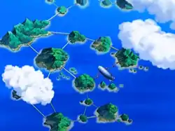 In the anime, Canalave City is located on a chain of islands connected by bridges. Ash, Dawn, Brock, and Barry first arrived there via blimp in Jumping Rocket Ship!, where the group, Team Rocket, and their Pokémon became scattered all over the city. The city is shown to be full of confusing alleyways with many dead-ends, as well as many bridges and canals to allow boats to travel. One of the city's landmarks is the Canalave Harbor, a large pier that allows people to travel to many places by boat, including Iron Island, Fullmoon Island, and Chocovine Town. A large bridge crosses the harbor which can open up to allow larger boats beneath it. On top, an underground sewer is also seen to lead to the harbor. The islands are also shown to contain many areas of forestland.