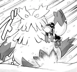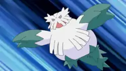 In Sliding Into Seventh!, Abomasnow was Candice's final Pokémon in her Gym battle against Ash. Abomasnow knocked out Staraptor and Grotle before Chimchar defeated her with Flame Wheel. Abomasnow made another appearance in Double-Time Battle Training!, where Candice used her to demonstrate move combinations for Dawn. She reappeared in a flashback in League Unleashed!. Abomasnow briefly appeared alongside Candice during the ending credits of Zoroark: Master of Illusions. Abomasnow's known moves are Ice Shard, Wood Hammer, Blizzard, Ice Punch, and Razor Leaf. | ||