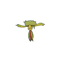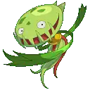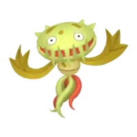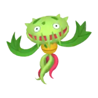 Carnivine is a green Pokémon resembling a Venus flytrap. Its circular eyes have small pupils, and it has spiky teeth. Its stem is yellow with green spots, with red and green vines beneath with the appearance of tentacles. It can hang from tree branches using these vines, and it is said to look like a plant. It has two arms resembling leaves with three leafy 'fingers' each. Its mouth can open to about 180 degrees wide. With its mouth wide open, it attracts the prey it waits for with sweet-smelling saliva, then chomps down. It takes a whole day to eat prey. It lives in forests and marshes. Its diet consists mostly of insects and small bugs.
