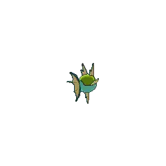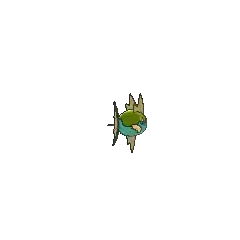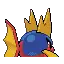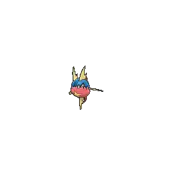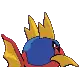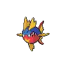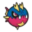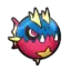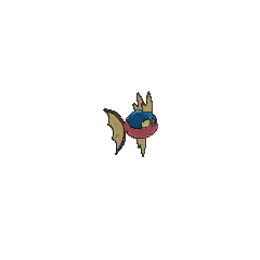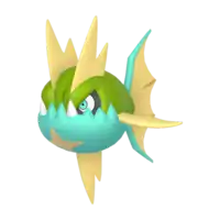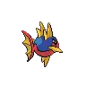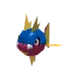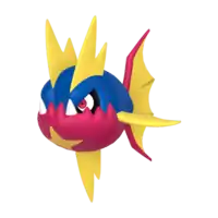 Carvanha is a fish Pokémon with a body covered in tiny, sharp denticles. The top half of its spherical body is blue, while the bottom half is red with a yellow, four-pointed star below its mouth. It has two yellow dorsal fins above its eyes that resemble shark fins, and a matching pelvic fin on its belly. Its pectoral fins are also yellow. The caudal fin is composed of two red spines with a thin yellow membrane stretched between them.