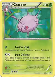 Poison Sting and Iron Defense are both moves in the Pokémon games that Cascoon can learn. This card's Pokédex entry comes from Pokémon Y.
