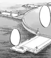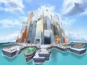 Due to the geography of Unova's central peninsula, Castelia City's wharf is shaped so that it extends around most of the city. The wharf is considered the outer layer of the city, where many important skyscrapers and other buildings stand. The Pokémon Center can be found in the east of the wharf, and other important locations such as the Battle Company and Passerby Analytics HQ can be found in the west.
