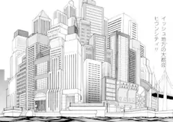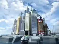 Castelia City (Japanese: ヒウンシティ Hiun City) is a large seaside city located in south central Unova. Unlike other cities, Castelia is a huge, sprawling metropolis, sporting many towering skyscrapers and other tall buildings. It is the heart of business and economy of the Unova region, as opposed to its sister city, Nimbasa City, which is the heart of leisure and entertainment. Most of its city streets are crowded with different people rushing around, trying to get to work, home, or other places, creating a hustle and bustle scene for city life. The city exists on the bottom of Unova's central peninsula, south of the desert and north of the sea, making for a perfect harbor city.
