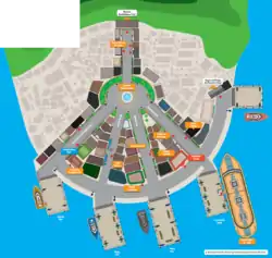 There are five piers on the waterfront based on five human fingers[1] where certain ferries are docked.