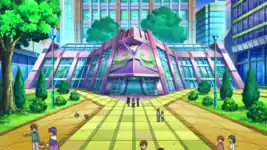 The Castelia Gym is a lilac building with huge glass windows on the walls and roof and a plant pattern above the front door. It is surrounded by skyscrapers and trees on Castelia City's Gym Street. Leading to the front door are camouflage tiles, while the inside is a botanical garden containing trees from Pinwheel Forest, with a path going through the vegetation to the sand-covered battlefield. Bug Pokémon such as Sewaddle also reside here in the garden. Around the battlefield is more foliage, with two big propagators on its sides.