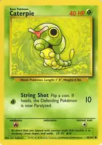 Caterpie (Japanese: キャタピー Caterpie) is a Grass-type Basic Pokémon card. It was first released as part of the Base Set.