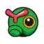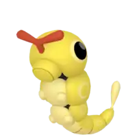 Caterpie is a Pokémon that resembles a green caterpillar with a yellow underside and teardrop-shaped tail. There are yellow ring-shaped markings down the sides of its segmented body, which resemble its eyes and are meant to scare off predators. Its most notable characteristic is the bright red antenna (osmeterium) on its head, which releases a stench to repel predators. Despite these features and its camouflage in green foliage, Caterpie is often preyed upon by Flying-type Pokémon. Its four tiny feet are tipped with suction cups, permitting this Pokémon to scale most surfaces with minimal effort.