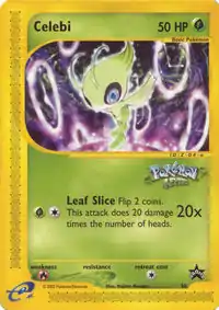 Celebi (Japanese: セレビィ Celebi) is a Grass-type Basic Pokémon card. It was first released as one of the Wizards Black Star Promos.