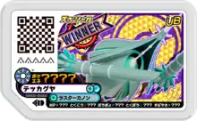 This disk was awarded as a prize at the Full-Force Battle ~Ultra Beast Challenge!~ event held at the 50th Next Generation World Hobby Fair, which took place at Makuhari Messe, Chiba on June 29 and 30, 2019. Entrants were challenged to defeat Battle Leader Seraji and 1 of his 2 possible teams of 3 Pokémon. Those who successfully defeated all 3 Pokémon could select to dispense a "WINNER" version of this disk, a Buzzwole disk, or a Guzzlord disk following the battle. Entrants who were not successful were randomly awarded a non-winner version of this disk, the Celesteela disk, or the Guzzlord disk. The 10 players of junior high school age and below as well as the 5 players of high school age and above with the highest score following the conclusion of each day were each awarded a certificate and a mounted set of special gold versions of all 3 disks in an acrylic case.