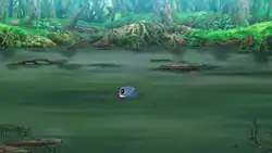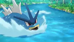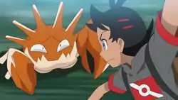 Using Caterpie's String Shot, Ash and Goh started to climb over the Marsh, only to be ambushed by a Kingler and Krabby. Goh managed to catch Krabby as they continued along their journey. As Ash and Goh started to cross a river by jumping on the stones, a Gyarados attacked them but Goh was unable to catch it. After falling into the river, Ash and Goh ended up going over a waterfall.