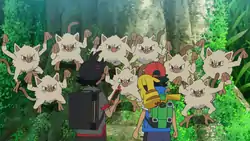 Ash and Goh visited Cero Island in search of Mew and traveled there by boat. While exploring the jungle, they encountered a group of Mankey, and Goh caught one of them. This enraged the other Mankey, leading them to chase Ash and Goh into a marsh where Ash nearly sank, only to be saved by Goh's Heracross.