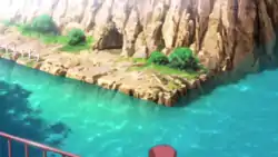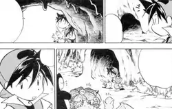 Cerulean Cave appeared in And Mewtwo Too?! and And Mewtwo... Three!. Upon hearing from Bill about a monster that had caused massive destruction in the northwest sector of Cerulean City, Red went to investigate Cerulean Cave, where the monster was said to have fled to. Once Red arrived at the cave, he and his Pokémon were soon caught in a tornado, which seemed to originate from inside the cave. Red and his Pokémon were saved from being blown away by Blaine and his Rapidash. Blaine explained that the tornado was actually Psywave, a Psychic-type move capable of both attacking and defending at the same time, and the user of the move was Mewtwo, the "beast" sighted in Cerulean City.