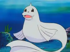 Dewgong first appeared as a Seel, holding out the Cascade Badge, when Ash was about to challenge the Sensational Sisters. Later, Seel was one of the Pokémon performing in a play hosted by the sisters. It evolved into a Dewgong while battling Jessie's Arbok. | ||