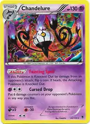 Chandelure (Japanese: シャンデラ Chandela) is a Psychic-type Stage 2 Pokémon card. It was first released as part of the Phantom Forces expansion.