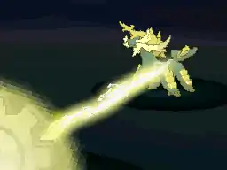 Zekrom's tail and the spike on its head glow light blue. It then fires a light blue beam of energy surrounded with streams of electricity from its mouth at the opponent. | ||