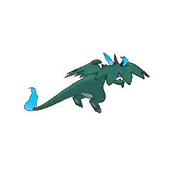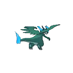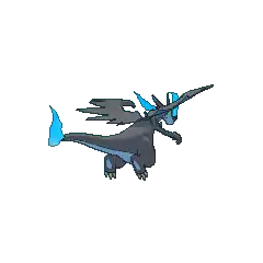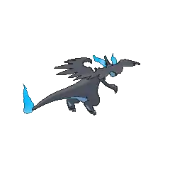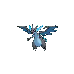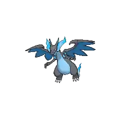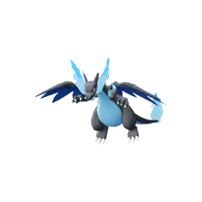 As Mega Charizard X, its body and legs are more physically fit, though its arms remain thin. Its skin turns black with a sky-blue underside and soles. Two spikes with blue tips curve upward from the front and back of each shoulder, while the tips of its horns sharpen, turn blue, and curve slightly upward. Its brow and claws are larger, and its eyes are now red. It has two small, fin-like spikes under each horn and two more down its lower neck. The finger disappears from the wing membrane, and the lower edges are divided into large, rounded points. The third joint of each wing-arm is adorned with a claw-like spike. Mega Charizard X breathes blue flames out the sides of its mouth, and the flame on its tail now burns blue. It is said that its new power turns it black and creates more intense flames.