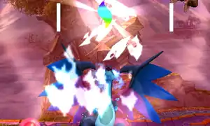 NA: In this powerful Final Smash, Charizard Mega Evolves into Mega Charizard X and takes to the air. In this form, it can charge violently in any direction or shoot horizontal blasts of fire that launch foes. Mega Charizard X isn't invulnerable, though-in fact, taking damage will actually reduce the time you can stay transformed.