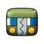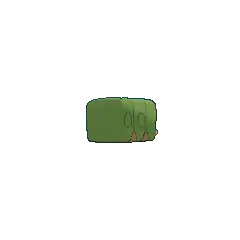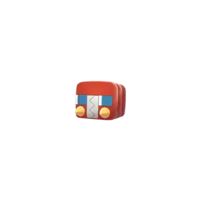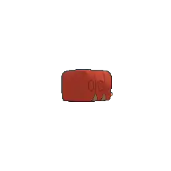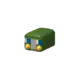 Charjabug is a small, cuboid Pokémon resembling an insect. Its body consists of three square segments. The last two sections have a thin, ring-like marking and a stubby brown leg on each side. Each eye is covered by a blue screen and are only visible when they glow. Two short, yellow spikes extend from the front square: one on each side of its rectangular mouth. The mouth itself is gray and has two jaws that close sideways, shaped like a lightning bolt when open.