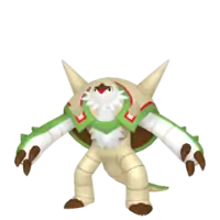Chesnaught is renowned for its tank-like body; it is capable of flipping a 50-ton truck. Once it gets into its defensive stance with its hands covering its face, it can stand up to a bomb's explosion. It will not hesitate to use its sturdy body to shield its allies from danger. In the past, Spiky Shield was its signature move.