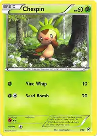 Vine Whip and Seed Bomb are both moves in the Pokémon games that Chespin can learn. This card's Pokédex entry comes from Pokémon X.
