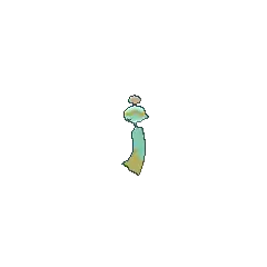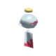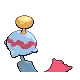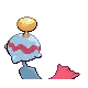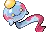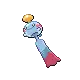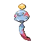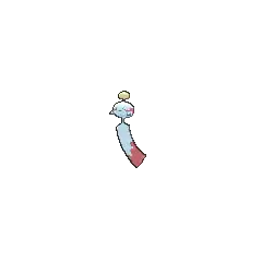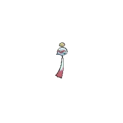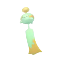 Chimecho is a small, round Pokémon with a mainly bluish-white body shaped like a fūrin wind chime. It has beady, yellow eyes and three stubby limbs. Its body has a horizontal amaranth-colored pattern. Underneath its body extends a long, tag-like tail that has amaranth patterning at the bottom. A yellow, globular growth, referred to as a suction cup or a sucker, is connected to the top of its body.